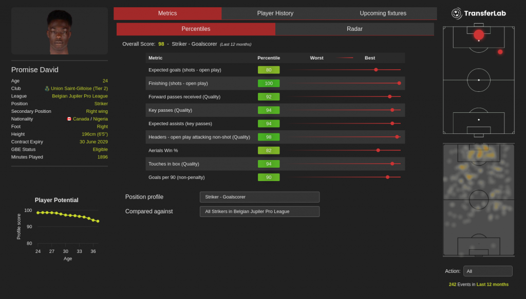 Promise David would be on the older side, around the same age as Marmoush was when the Egyptian star signed for Frankfurt two summers ago. David has taken an unconventional route so far in his career, originally coming through the Toronto FC academy before going out to Europe and playing in Malta and Estonia. Union Saint-Gilloise signed him last summer, and his debut season in the Belgian Pro League was quite successful. FBref had him in the top 10 for total goals and assists, non-penalty goals and assists per 90, total non-penalty expected goals and assisted goals, and npxG+xAG/90, while his TransferLab profile shows elite contributions across the board relative to Jupiler Pro strikers.