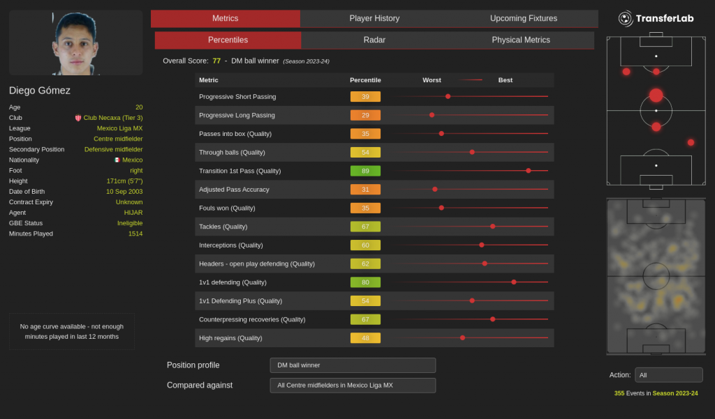 This season, the club has again cast the net wide. Probably the most impressive find is Diego Gómez, a tidy defensive midfielder who will probably play as an 8. In 2023/24, he racked up significant minutes for Necaxa and although his playing time dropped a lot in 2024/25, he maintained elite levels of defensive output. His transitional passing and all-round defensive ability was above average in a much stronger league (Liga MX) and so his in-possession game especially should scale comparatively in a weaker league set-up.