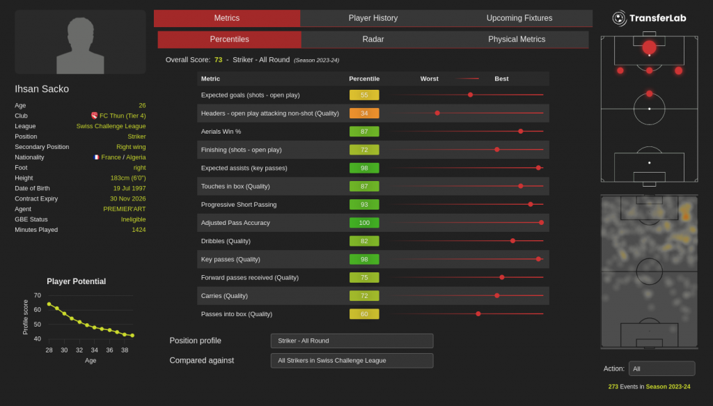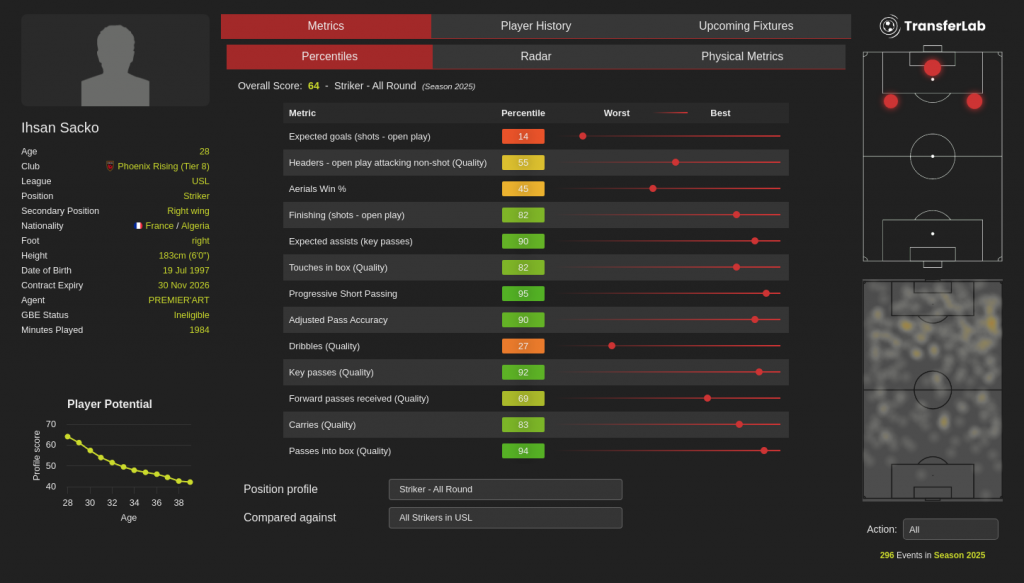 Sacko came through at Strasbourg and played Ligue 1 minutes for Nice between 2017/18 and 2019/20, but following that bounced around lower leagues before arriving at Thun in 2023/24. Sacko showed real creative excellence in his stint in Switzerland’s second tier (Thun were relegated at the end of 2019/20 and were only promoted again in 2024/25), a pretty comparable league to USL in terms of team strength. While Sacko’s expected goals numbers are relatively poor, he has largely maintained that excellence and managed seven goals and seven assists in 2025, leading PRFC for goal involvement.