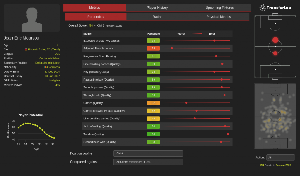 Another crucial signing was actually made last season, when Jean-Éric Moursou was taken on loan from Valenciennes (part of Sport Republic’s MCG). Moursou had a superb 2025 in Phoenix’s colours, putting up elite numbers for line-breaking passes, through balls, 1v1 defending, and tackles, and generally showing well-above league average quality in most facets of midfield play. Making the loan signing permanent brings back a player who has proven quality at the level and also knows the side, and head coach Pa-Modou Kah well.