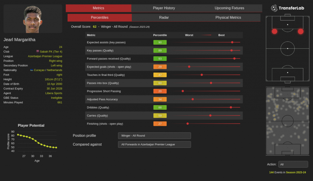 Margaritha was picked up on a free transfer from Sabah FK in Azerbaijan, where he played one full season following a €400k transfer from TOP Oss in the Netherlands. Margaritha profiled as passing creator, with elite levels for xA, key passes, and forward passes received, while his dribbling was also very strong. His weakness in other areas was mitigated by these strengths, and while the APL has some significantly weaker teams, the top end (Qarabg, Neftchi, Zira, and Sabah, are much stronger than USL sides. At PRFC, Margaritha’s passing quality dropped off, but he maintained top 10% levels in forward passes received and significantly improved the quality of his dribbling. His dynamism and on-ball quality drew the attention of SK Beveren in Belgium’s second tier, where he already has six goals and six assists.