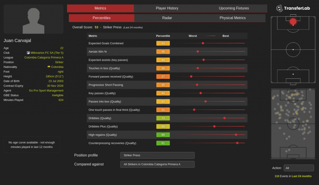 Lastly, Juan Carvajal was recruited from Millonarios FC. His data is harder to parse, given relatively limited minutes across the last few seasons at Millonarios and Internacional de Bogotá, but he shows promise as a pressing forward and has a great physical profile.
