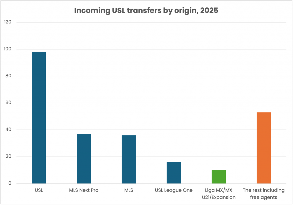 Much USL recruitment is, however, still done within the US, or targets American players abroad, with Mexico a favoured second destination. Of the 250 transfers done into the league in 2025, USL buying from USL dominates, with Next Pro and MLS close second and third. Mexican teams account for around 4%, while everyone else, including frees, make up 21%.